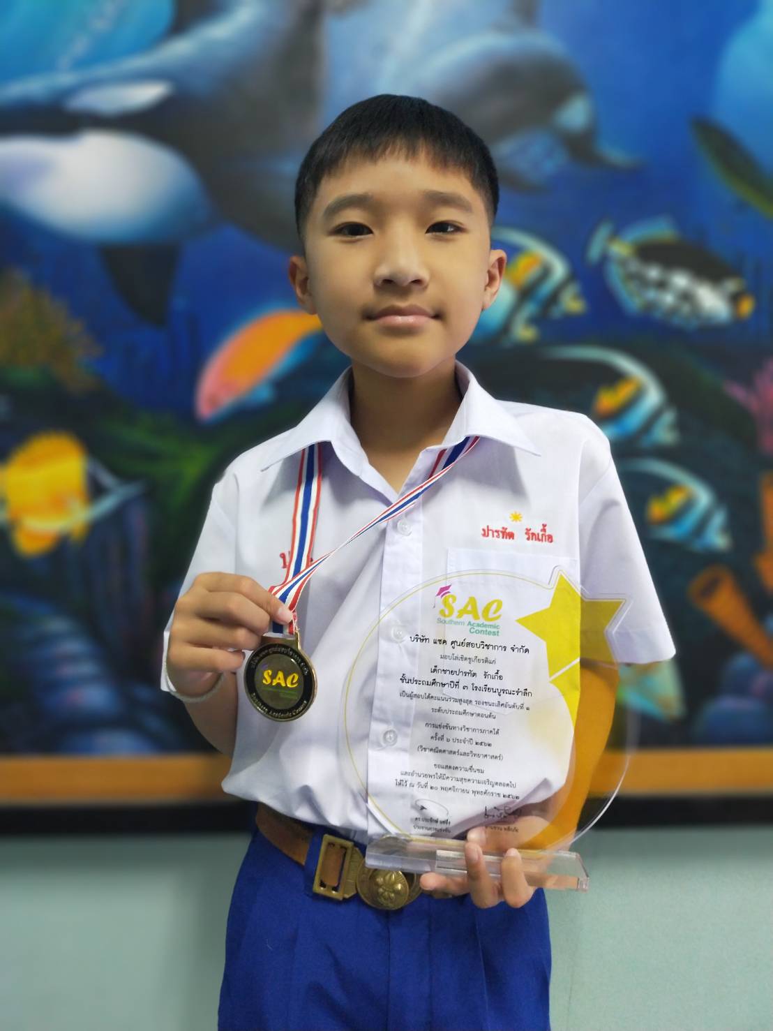 นักเรียนชั้นประถมศึกษาปีที่ 3 โรงเรียนแสงทองวิทยา ได้รับรางวัลชมเชยอันดับที่ 5 ระดับชั้นประถมศึกษาตอนต้น การแข่งขันทางวิชาการภาคใต้ คณิตศาสตร์และวิทยาศาสตร์ ครั้งที่ 6