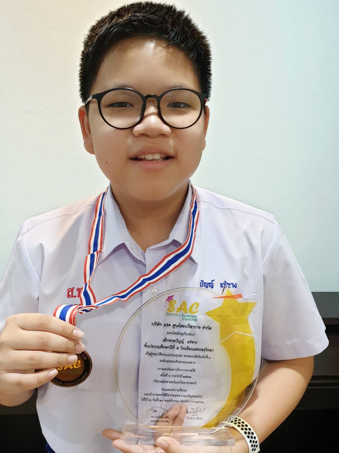 นักเรียนชั้นประถมศึกษาปีที่ 5 โรงเรียนแสงทองวิทยา ได้รับรางวัลรองชนะเลิศอันดับที่ 1 ระดับชั้นประถมศึกษาตอนปลาย การแข่งขันทางวิชาการภาคใต้ คณิตศาสตร์และวิทยาศาสตร์ ครั้งที่ 6